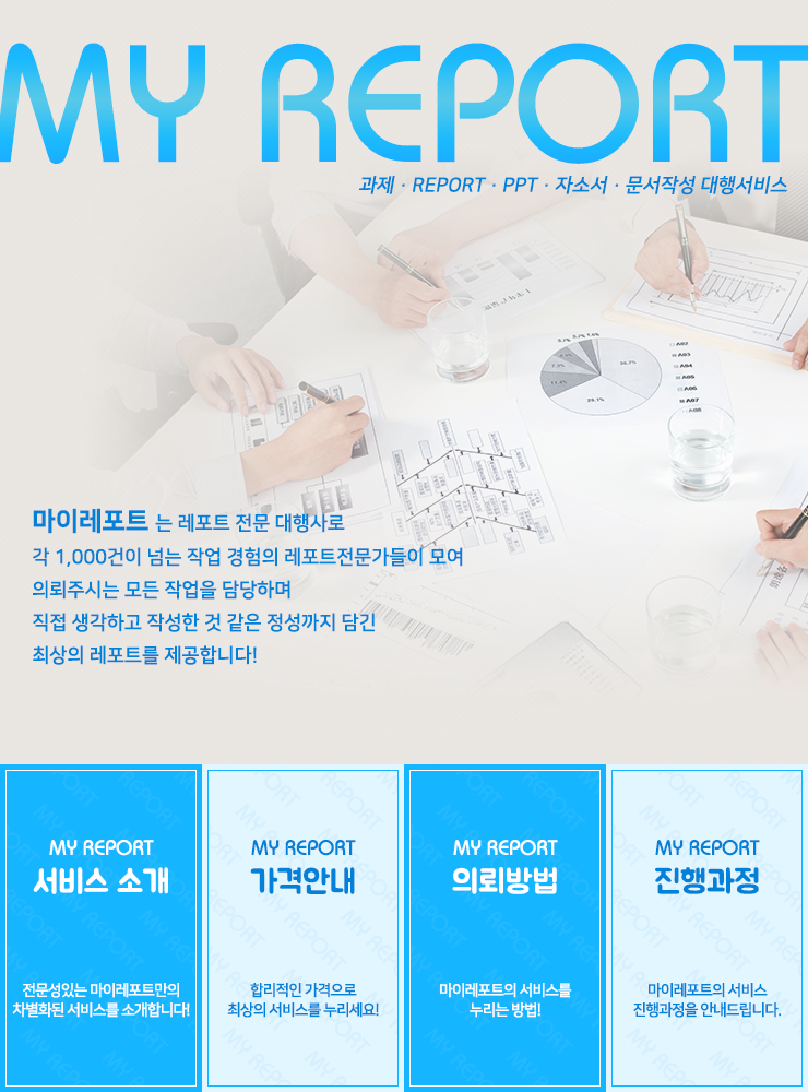 마이레포트에서 문서 작성을 담당해주시는 선생님들은 각 1000건 이상의 문서 작성 대행 작업을 맡아 진행한 경험을 가지고 있는 해당 업계에서 보기 드문 진정한 전문가분들이십니다.